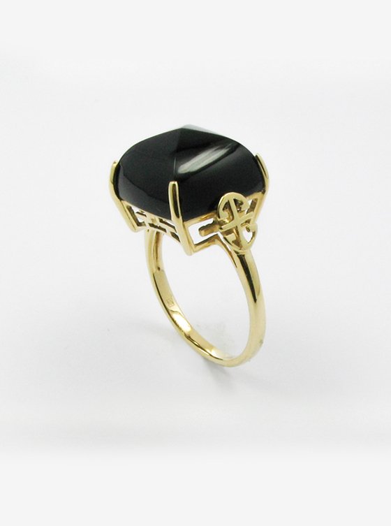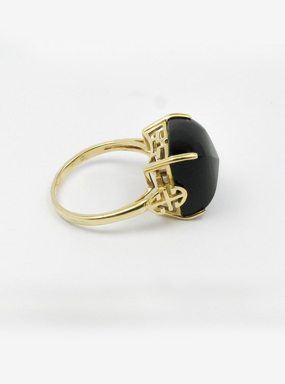 Black Agate Ring with Gold Filigree Design in 14K Yellow Gold